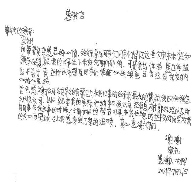 经过半个月治疗休养,刘军手部已无大碍。出院后的他写了一封感谢信并为公司送了一面锦旗,他说道,是BOB半岛·(中国)体育官方网站-BOB SPORTS这个大家庭让他感受到了关怀和温暖,他表示要把这种关怀变成工作上的动力,争取早日返回工作岗位,努力工作,回报大家的关心和关爱。